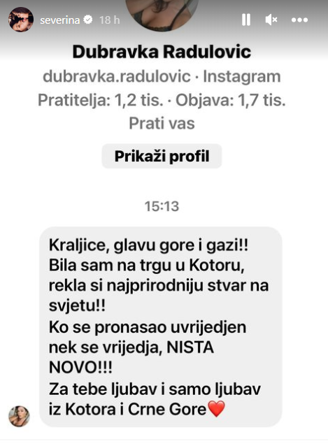‘Kraljice, glavu gore i gazi! Bila sam na trgu u Kotoru, rekla si najprirodniju stvar na svijetu! Tko se pronašao uvrijeđen – nek se vrijeđa, ništa novo! Za tebe ljubav i samo ljubav iz Kotora i Crne Gore’, zaključila je treća pratiteljica.