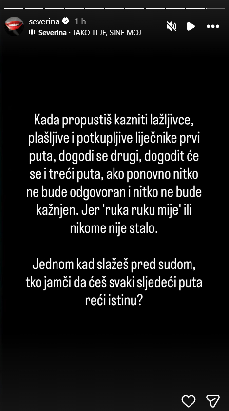 “Jednom kad slažeš pred sudom, tko jamči da ćeš svaki sljedeći put reći istinu?”, stoji na kraju njene poruke. Podsjetimo, njegovo vještačenje je bilo predmetom mnogih nagađanja, a Severina je javno pisala kako je liječnik bio pod pritiskom napisati nalaz koji ide u korist ocu Severininog djeteta Milanu Popoviću.