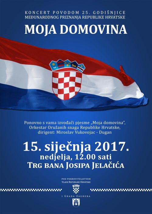 U povodu 25. godišnjice međunarodnog priznanja Republike Hrvatske, u nedjelju, 15. siječnja u 12:00 sati na Trgu bana Josipa Jelačića će se održati svečani koncert Moja domovina pod pokroviteljstvom Vlade Republike Hrvatske i Grada Zagreba, a okupit će brojne eminentne izvođače.