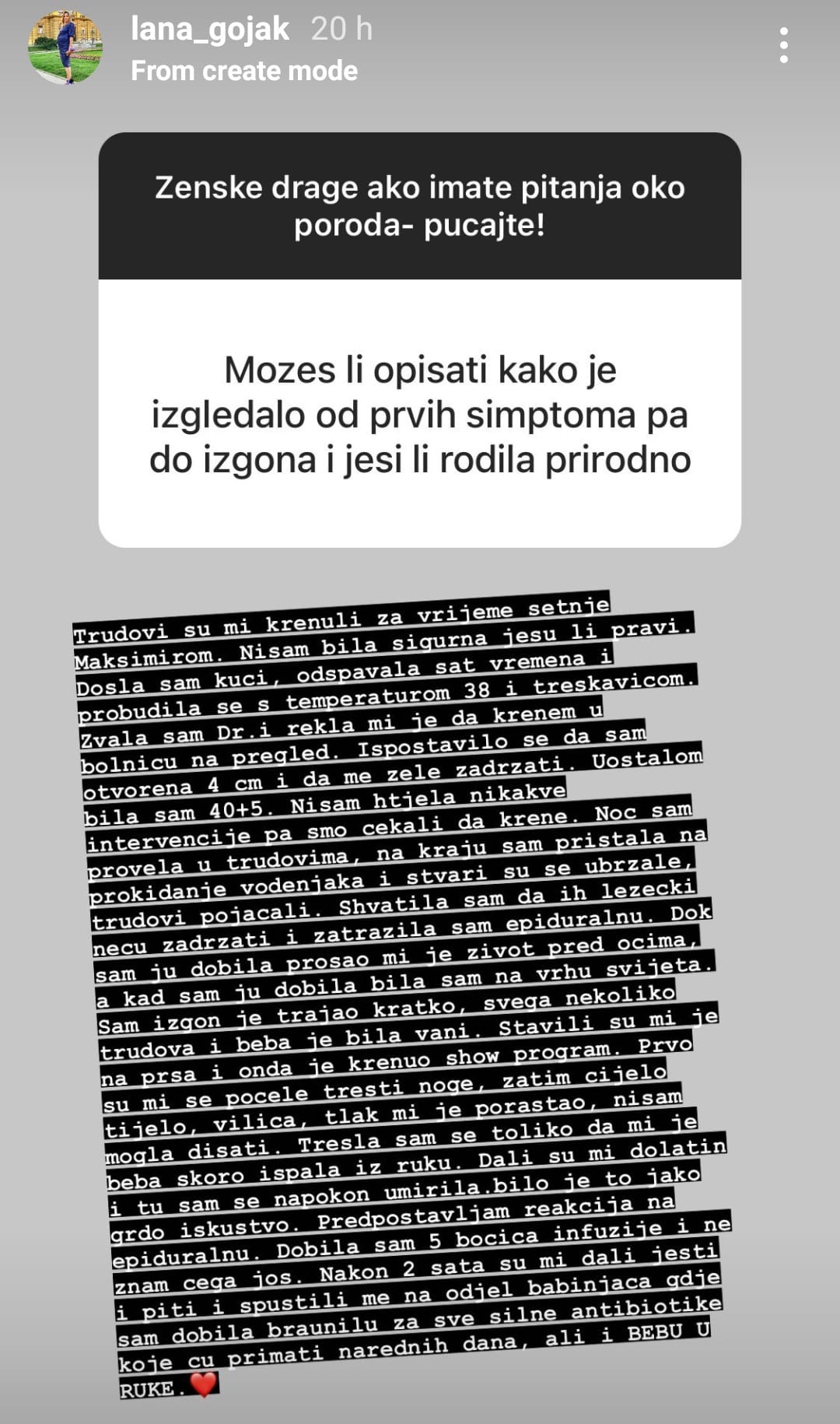 “Dok sam ju dobila prošao mi je život pred očima, a kad sam ju dobila bila sam na vrhu svijeta. Sam izgon je trajao kratko. Svega nekoliko trudova i beba je bila vani. Stavili su mi je na prsa i onda je krenuo show program. Prvo su mi se počele tresti noge, zatim cijelo tijelo, vilica, tlak mi je porastao, nisam mogla disati. Tresla sam se toliko da mi je beba skoro ispala iz ruku. Dali su mi dolatin i tu sam se napokon umirila. Bilo je jako grdo iskustvo”, napisala je.
