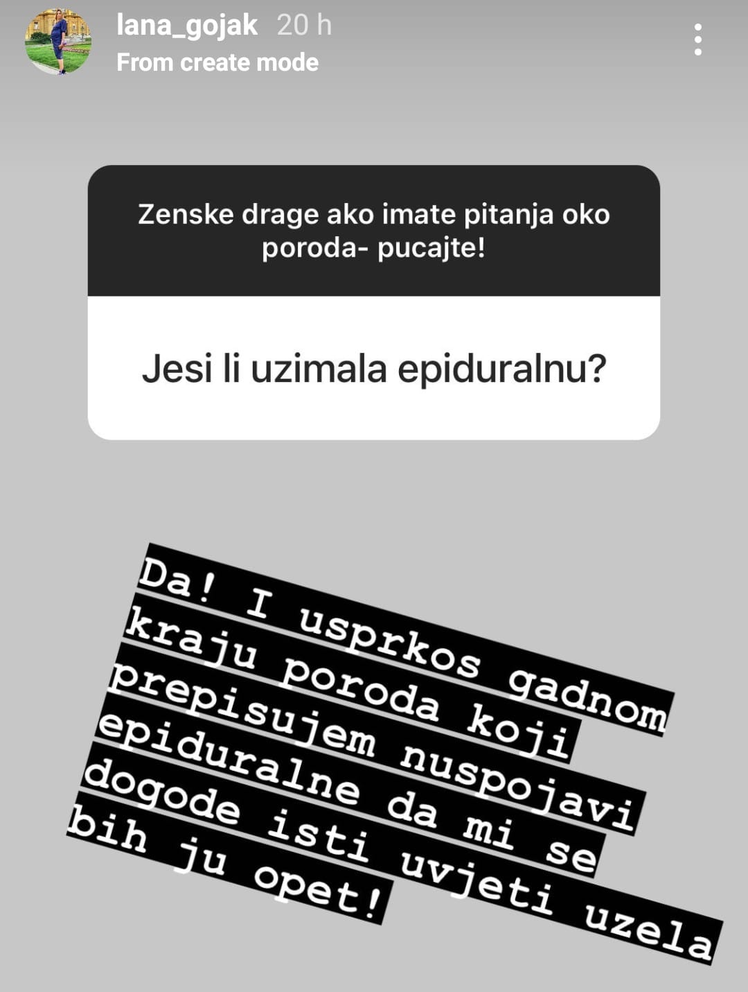 “Došla sam oko 5 popodne s laganim trudovima, rodila prije 10 ujutro. Cijelu noć sam slušala meditacije, disala, čak sam čitala i knjigu, a onda kad se zahuktalo sam lupila glavom o zid od bolova i tražila epiduralnu”, rekla je.