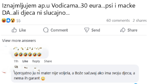 “Iznajmljujem apartman u Vodicama, 30 eura. Psi i mačke da, ali djeca ni slučajno”, napisala je vlasnica apartmana u oglasu u popularnoj Facebook grupi te ubrzo pokrenula brojne reakcije.