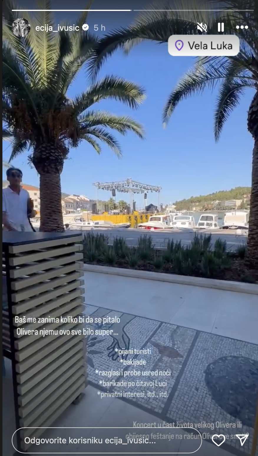 “Baš me zanima koliko bi, da se pitalo Olivera, ovo sve njemu bilo super… Pijani turisti, bakljade, razglasi i probe usred noći, barikade po čitavoj Luci, privatni interesi itd. itd. Koncert u čast velikog Olivera ili obijesno feštanje na račun Oliverove smrti?”, napisala je.