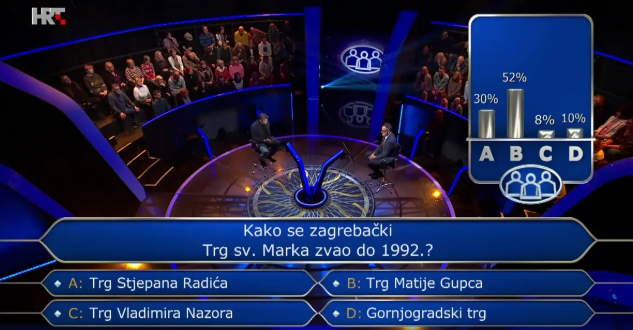 Publika je 30 posto glasova dala odgovoru A, 52 posto odgovoru B, 8 posto odgovoru C te 10 posto odgovoru D. Mario se nadao da se publika nije povela za njegovim razmišljanjem. Nakon kraćeg dvoumljenja, kao konačan odgovor odabrao je B: Trg Matije Gupca.