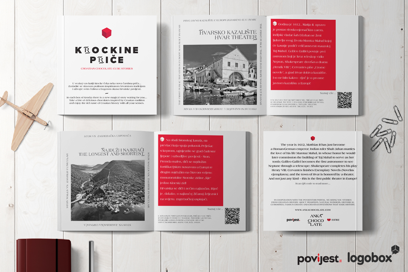 Marketinška agencija Logobox zadužena je za samu ideju, dizajn i produkciju brošura, a autori portala Povijest.hr napisali su deset priča koje će vas ostaviti bez daha. Ove predivne priče moći ćete pronaći u Krockinim kutijama sa slasnim pralinama od kreme od lješnjaka i likerom Marashino.
