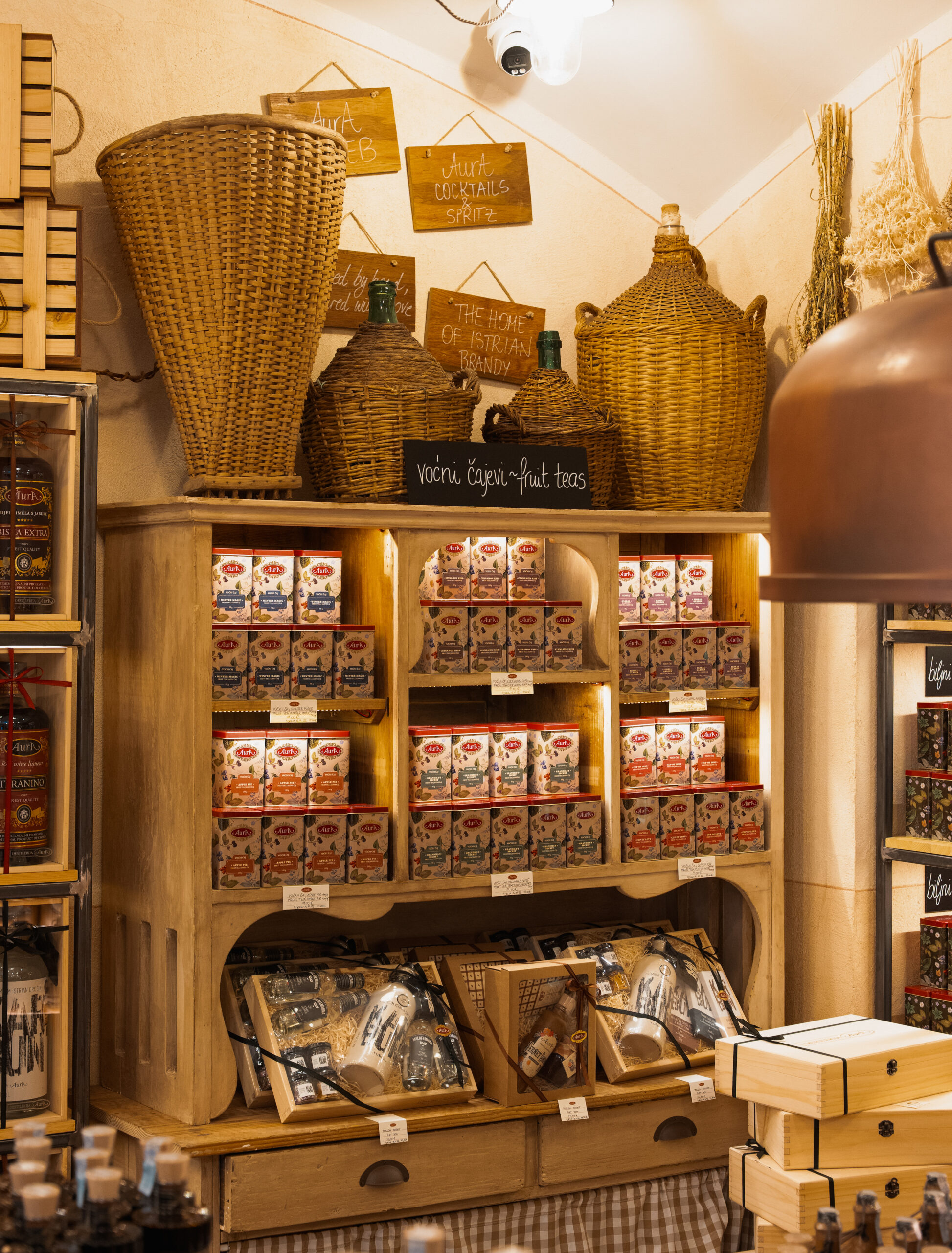 U kreativno uređenom prostoru, koji spaja autentičan istarski šarm, tradiciju i nostalgiju s vrhunskim proizvodima, posjetitelji mogu uživati u cjelokupnoj ponudi destilerije Aura – od kultnih Aura rakija i likera, ginova, džemova, čajeva i čokolada, preko ekskluzivnih izdanja, pa sve do profinjenih poklon paketa idealnih za svaku priliku.
