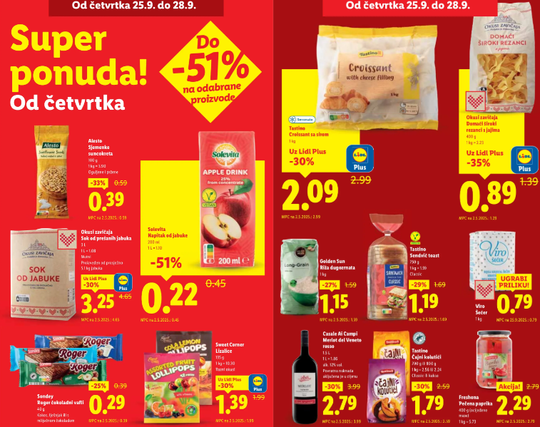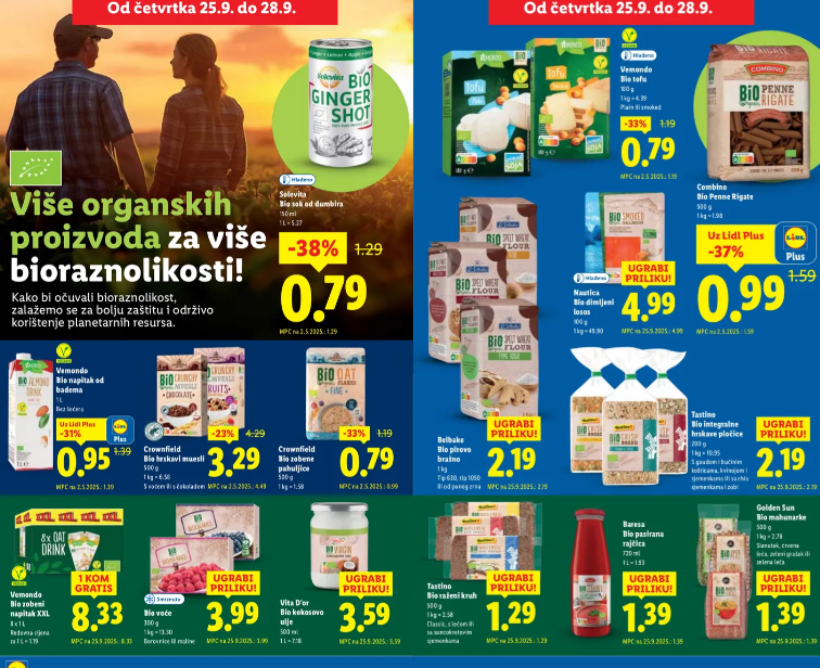 Pametna kupnja nikad nije bila važnija. Cijene rastu, a svaka prilika za uštedu dobro dođe, posebno kada možete kupovati kvalitetne i provjerene proizvode po znatno nižim cijenama. Upravo zato Lidl je pripremio novu akciju koja traje od četvrtka, 25. rujna, do nedjelje, 28. rujna, a donosi odlične popuste na organsku hranu, meso, delikatese i svakodnevne namirnice.