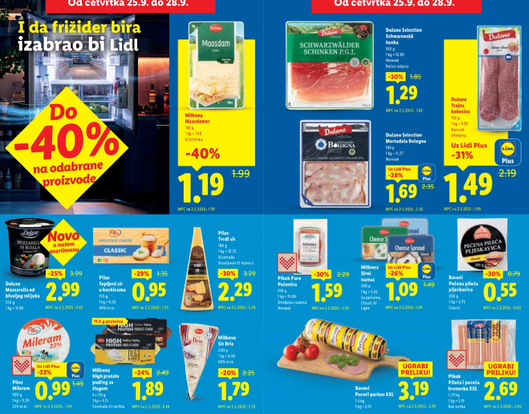 Vrijedi izdvojiti Freshona pečenu papriku 400 g, sniženu s 2,79 € na 2,29 €, kao i Dulano Selection Schwarzwald šunku, koja umjesto 1,85 € će koštati 1,29 €. Tu je i Pikok Pure pečenica, snižena 30 posto, pa stoji 1,59 €, dok će Baroni pileća pljeskavica iznositi svega 0,55 €. Ljubitelje sireva razveselit će Pilos topljeni sir u kockicama, koji će biti snižen s 1,35 € na 0,95 €, te Pilos tvrdi sir 180 g, po cijeni od 2,29 €.