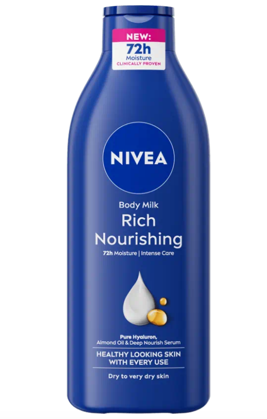 NIVEA legendarno plavo mlijeko za tijelo je više od 60 godina sinonim za bogatu njegu suhe kože, a sada vam predstavlja novu inovativnu formulu koja pruža klinički dokazanu 72-satnu hidrataciju. S trenutnim i dugotrajnim rezultatima, nova formula NIVEA mlijeka za tijelo osmišljena je da ti pruži prekrasnu i zdravu kožu i pobrine se za dobar osjećaj i samopouzdanje koje se vidi.
