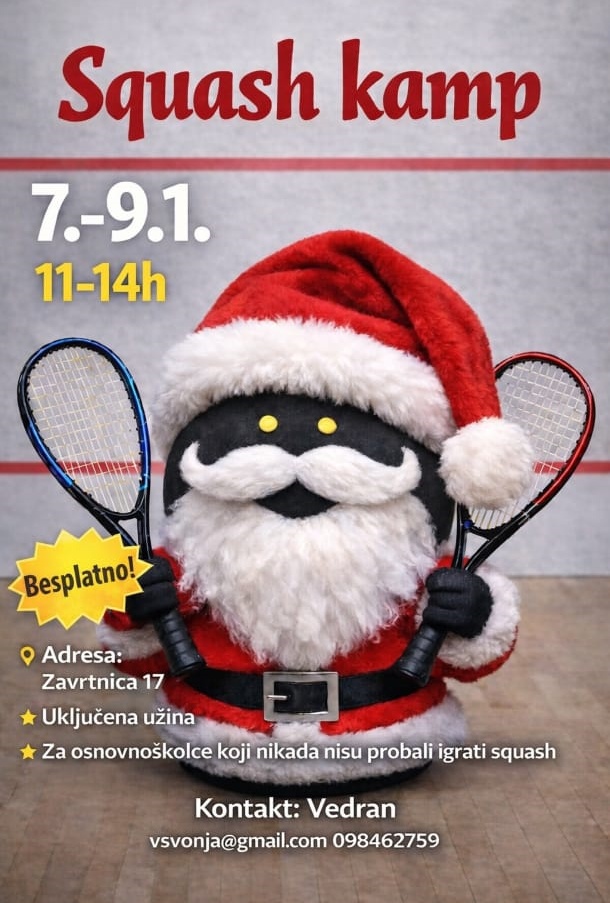 U suradnji s TheFitness&SQUASH-om, najvećim squash centrom u Hrvatskoj, tijekom zimskih školskih praznika organizira se besplatan squash kamp namijenjen učenicima osnovnih škola. Kamp će se održati od 7. do 9. siječnja 2026. godine, u jutarnjim terminima od 11 do 14 sati, u prostoru SQUASHtowera na adresi Zavrtnica 17 u Zagrebu.