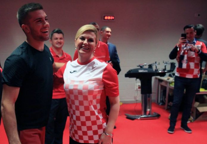 Predsjednica je usprkos porazu bila dobre volje pa je dio svoje energije odlučila prenijeti igračima. Već prema običaju spustila se u svlačionicu te se grlila i fotografirala s Bornom Ćorićem, Marinom Čilićem, Ivanom Dodigom i Matom Pavićem, a pozdravila se i s francuskim izbornikom, nekada velikim igračem Yannickom Noahom.