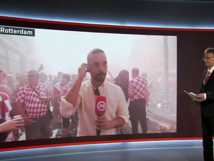 S njima je bio i reporter Dnevnika Nove TV koji se javio u vijesti u 17 sati. No, usred javljanja uživo brojni navijači željni trenutaka pred kamerom, pretjerano su ga ometali te su ga zalili s pivom.