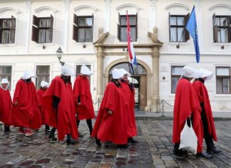 Noseći parole "Radnice, a ne sluškinje", "Stop fundamentalizmu", "Ženama je dosta", "Plenkoviću, obećao si", "To vodi državu?" dvadesetak prosvjednica obučenih u sluškinje prosvjedovalo je...