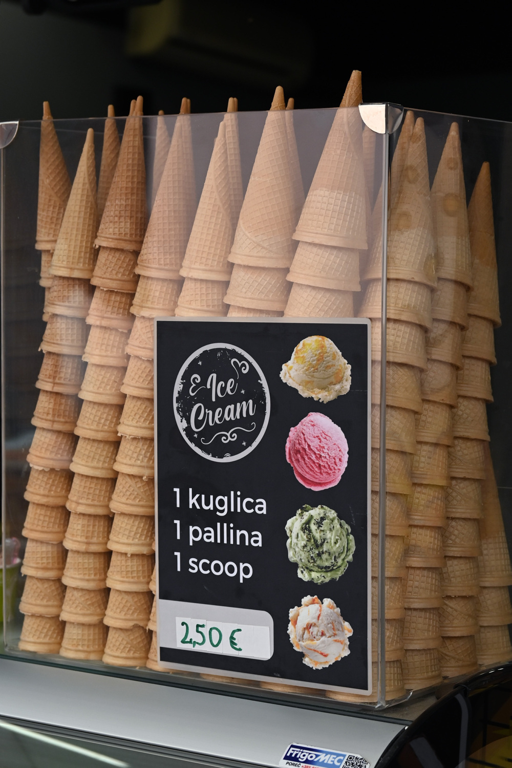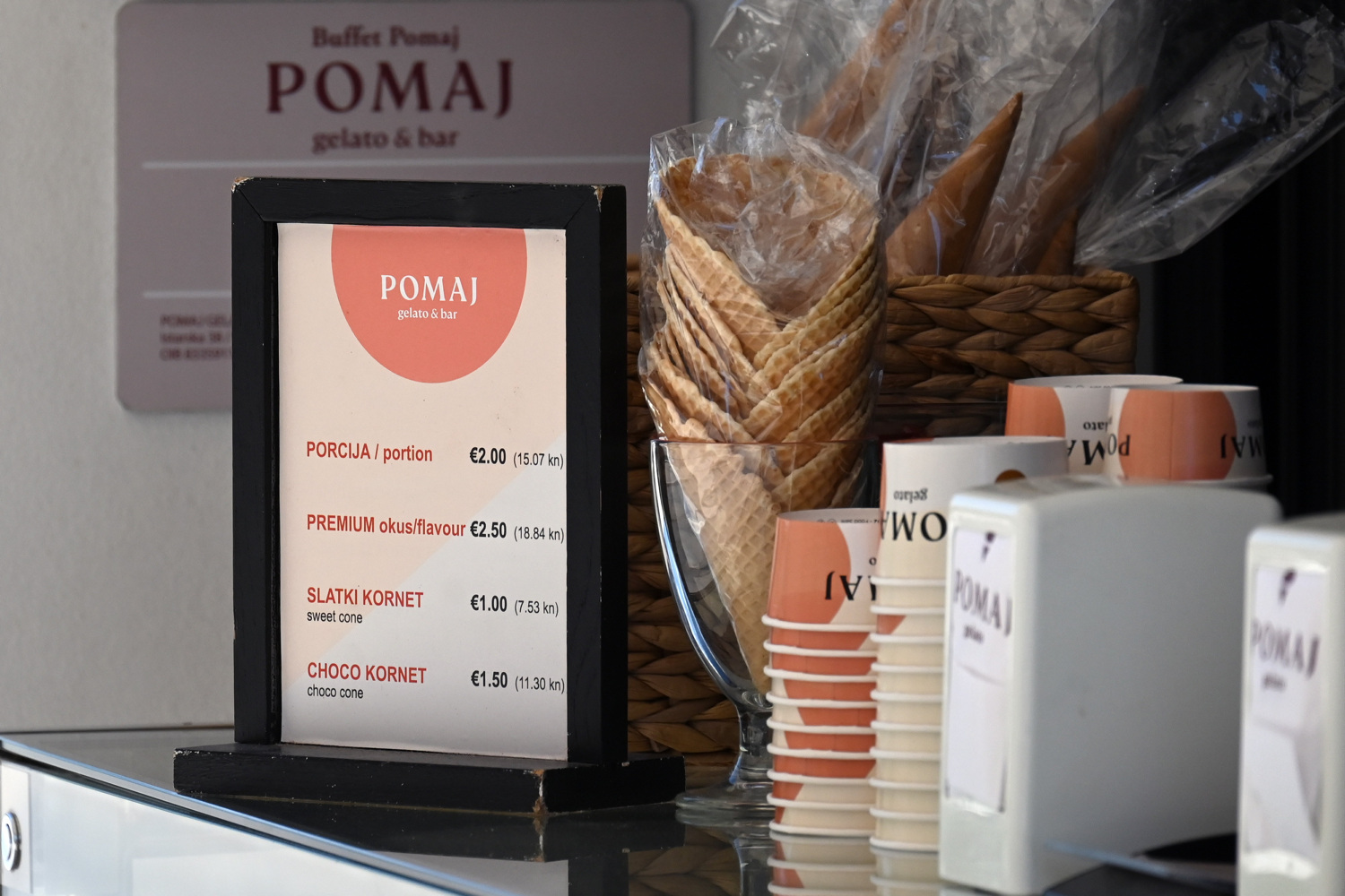 U drugoj slastičarnici je pak bilo nekoliko cijena. Može se kupiti kuglica po dva eura dok je premium okus nešto skuplji, kuglica je 2 i pol eura. Ako ćete kuglicu u slatki kornet treba nadoplatiti još jedan eura dok za chocco kornet treba izdvojiti dodatnih jedan i pol euro.