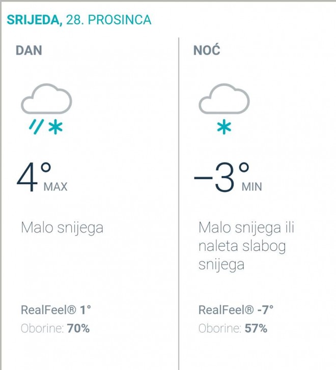 Ipak na kraju tjedna čeka nas sunce i suho vrijeme bez oborina. Prema kraju godine padat će temperature koje bi u novogodišnjoj noći trebale doseći -7 stupnjeva. Ulazak u “novo leto” pratit će padaline i tmurno vrijeme.