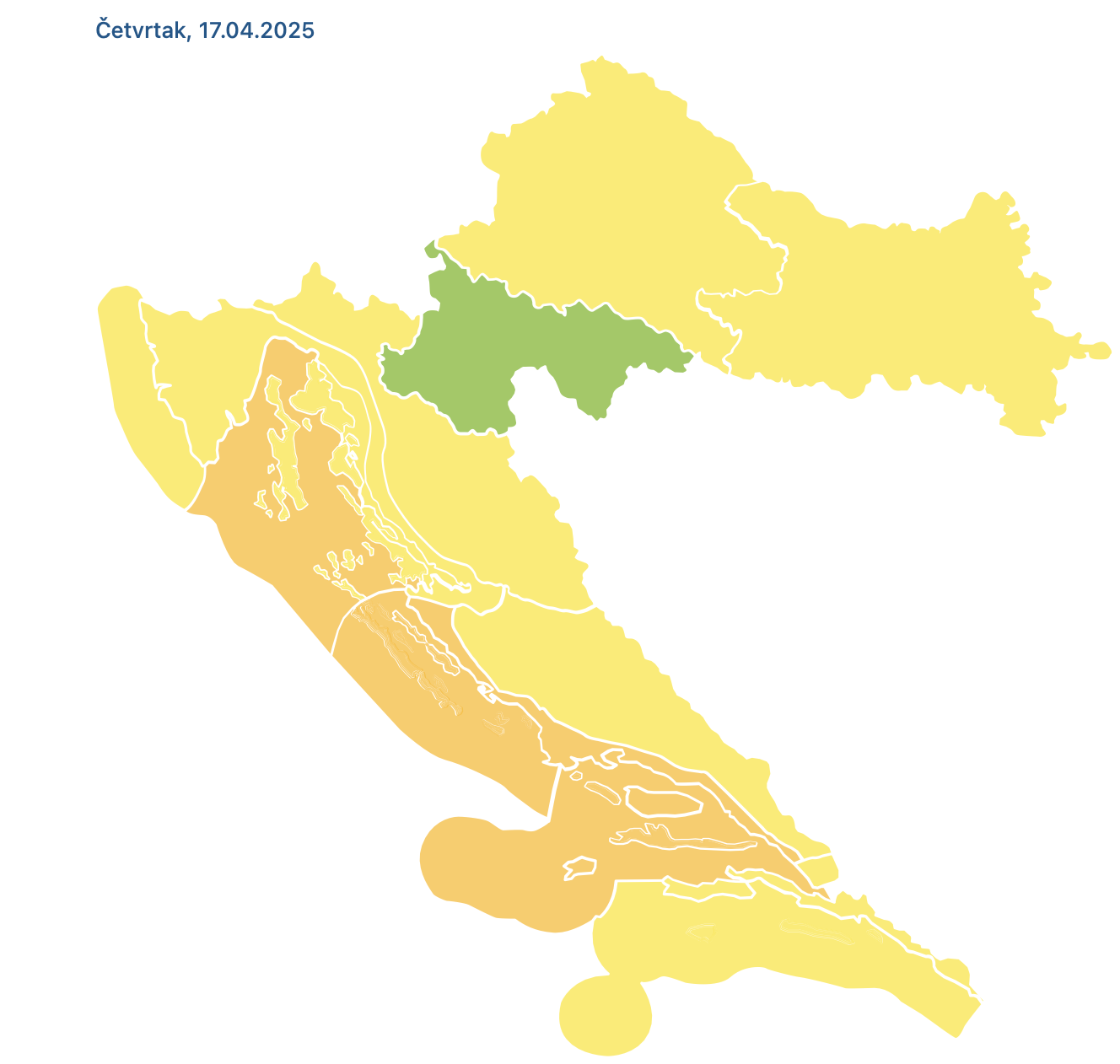 Upaljen je i meteoalarm za gotovo čitavu Hrvatsku. “Ponegdje su mogući izraženi pljuskovi s grmljavinom, osobito na istoku i sjeveru regije. Budite na oprezu zbog mogućih jačih grmljavinskih nevremena. Posebno pripazite u izloženim područjima kao što su planine, šume i livade odnosno otvoreni tereni. Mogući su prekidi u aktivnostima na otvorenom”, upozorili su iz DHMZ-a.