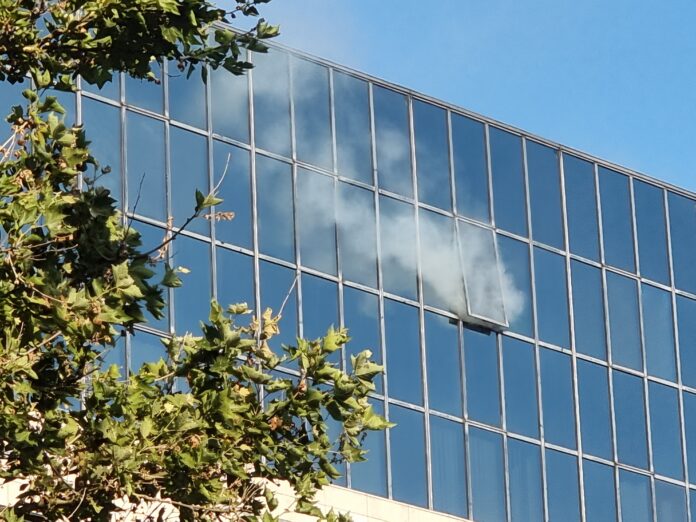U redakciju su nam stigle fotografije zgrade INE na Aveniji Većeslava Holjevca. Na slikama se vidi kako bijeli dim suklja kroz jedan od prozora na velikoj staklenoj zgradi.
