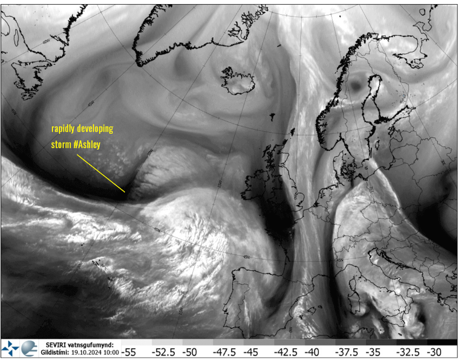 Oluja Ashley počela se formirati u središtu sjevernog Atlantika, pod snažnom mlaznom strujom vjetra koja će pojačati njen intenzitet. Očekuje se da će vjetrovi doseći brzinu od preko 300 km/h, dok će se oluja približavati Irskoj i Škotskoj.