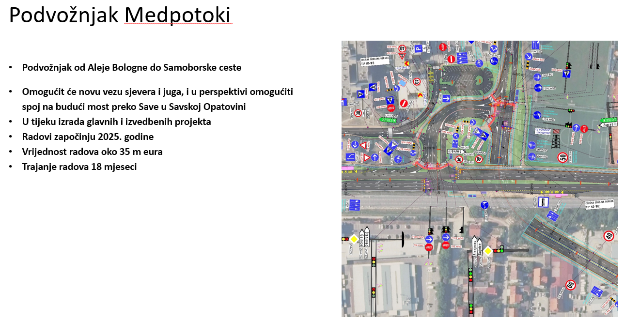 Najavio je i projekt “Podvožnjak Medpotoki“, koji bi trebao povezati Aleju Bologne i Samoborsku cestu, što bi poboljšalo povezanost sjevera i juga. Vrijednost projekta je 35 milijuna eura, a radovi će trajati 18 mjeseci i započet će sljedeće godine.