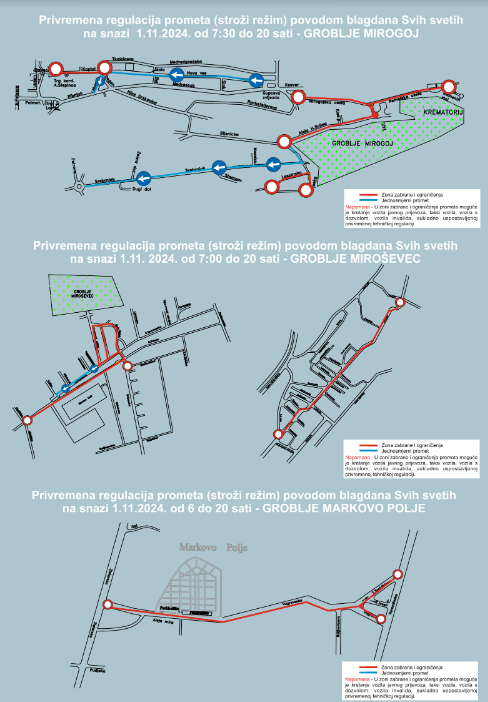 Stanje u prometu može se pratiti na internetskoj stranici ZGH.HR. U privitku se nalaze vizualni prikazi blažeg (26.-31.10. i 2.-3.11.2024.) i strožeg režima (1.11.2024.) ograničenja prometa.