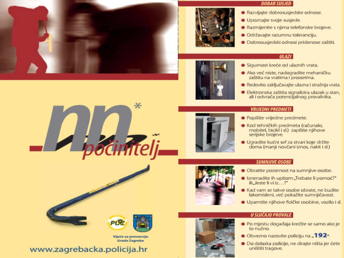 “Održavajte dobre odnose sa susjedima, razgovarajte s njima, budite upućeni i budite uočeni. Ne libite se obratiti nepoznatoj osobi koju ste zatekli na stubištu već uljudnim pitanjem koga traži, pokolebajte namjeru nepoznate osobe zlonamjernika. Nasilnici su skloni ponavljanju kaznenih djela pa svako neprijavljivanje i uskraćena izjava žrtve ili svjedoka može pridonijeti da se na istom mjestu ponovi kazneno djelo koje se moglo spriječit”, savjetuju iz policije.
