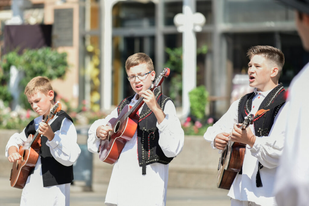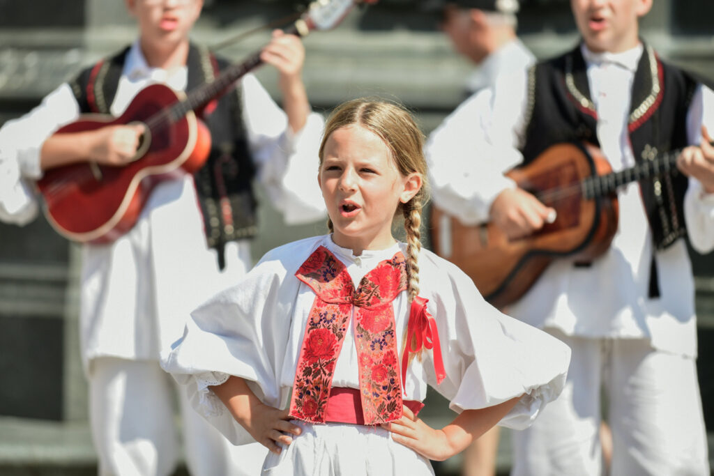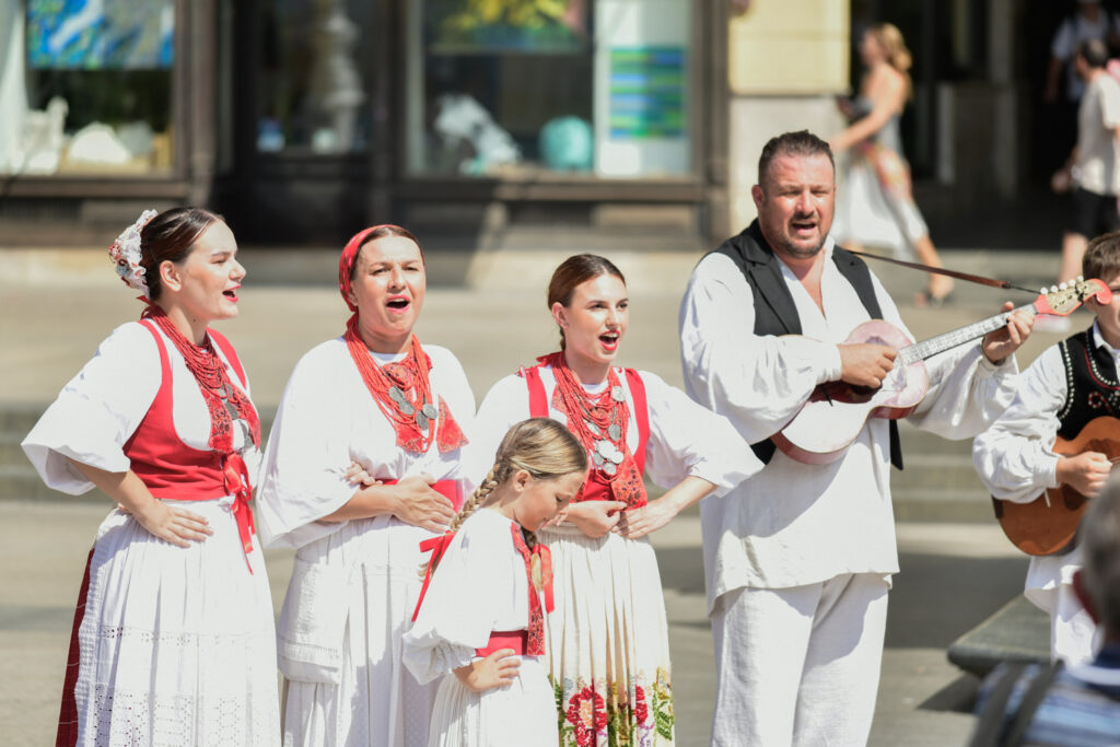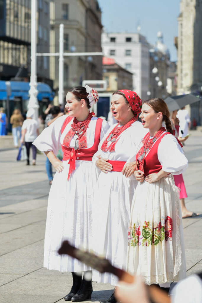 Ova mala folklorna grupa po najvećem suncu nasred Trga bana Josipa Jelačića veselo pjeva i pleše u narodnim nošnjama.