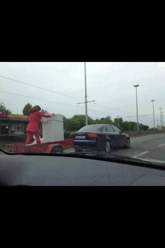 Naime, Zagrepčanka se vozila u prikolici automobila te je grčevito držala frižider kako ne bi sletio na cestu.