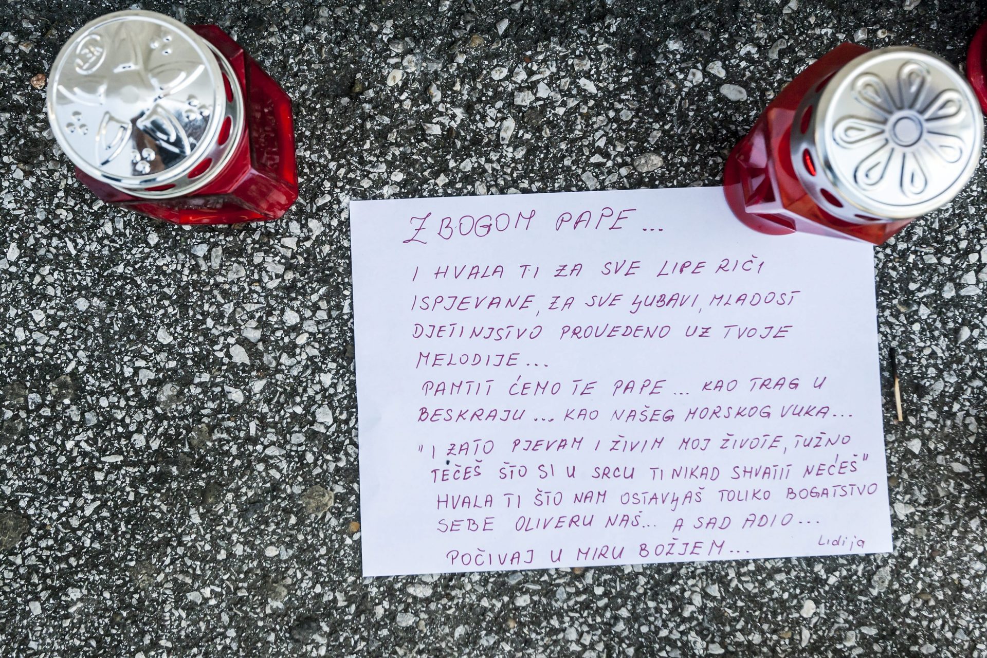 “Zbogom pape i hvala ti za sve lipe riči ispjevane, za sve ljubavi, mladost, djetinjstvo, provedeno uz tvoje melodije”, pisalo je u rukom ispisanoj poruci ispred Lisinskog prije četiri godine.