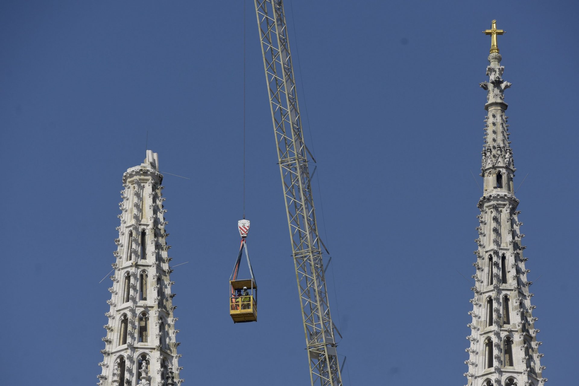 Nakon što je snažan subotnji vjetar onemogućio pobližu analizu vrha tornja zagrebačke katedrale, taj je posao odgođen i trenutno se odvija.