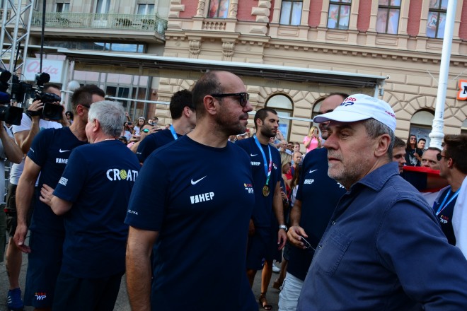 Trinaest zlatnih vaterpolista, izbornik Ivica Tucak i stručni stožer na Trg je stigao u autobusu otvorenog krova oko 18.20 sati, a potom su se s medaljama svjetkih prvaka popeli na pozornicu. Program je vodio bivši hrvatski reprezentativac Dubravko Šimenc, a mnoštvo je s posebnim pljeskom pozdravilo izbornika Tucka, Sandra Suknu, Luku Lončara i Javia Garciu.