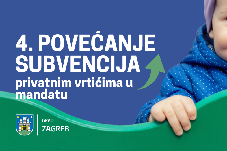 „Osiguravanje dostupnih i pristupačnih vrtića strateški je prioritet ove gradske uprave, i stoga četvrti put u mom mandatu povećavamo subvencije za mjesta u privatnim vrtićima”, izjavio je danas Tomislav Tomašević, gradonačelnik Grada Zagreba, predstavljajući odluku o novom, četvrtom povećanju subvencija za privatne vrtiće, kojom se iznosi subvencija povećavaju za dodatnih 60 eura mjesečno po upisanom djetetu.