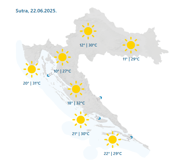 Početak ljeta u subotu, 21. lipnja, sa sobom je donio i visoke temperature u velikom dijelu Hrvatske. “Pretežno sunčano, mjestimice i vedro. Vjetar slab do umjeren sjeveroistočni. Na Jadranu umjerena, ponegdje i jaka bura i sjeverozapadni vjetar. Najviša temperatura zraka od 24 do 28, a na Jadranu te u unutrašnjosti Dalmacije i Istre od 29 do 32 °C”, prognoza je Državnog hidrometeorološkog zavoda za subotu.