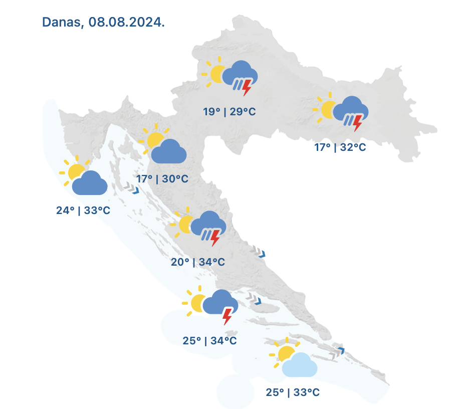 Djelomice sunčano s promjenljivom naoblakom, povremeno kiša, pljuskovi i grmljavina, prijepodne ponajprije u unutrašnjosti i na dijelu sjevernog i srednjeg Jadrana te ponovno navečer, uglavnom na sjeverozapadu, prognozira za četvrtak Državni hidrometeorološki zavod (DHMZ).
