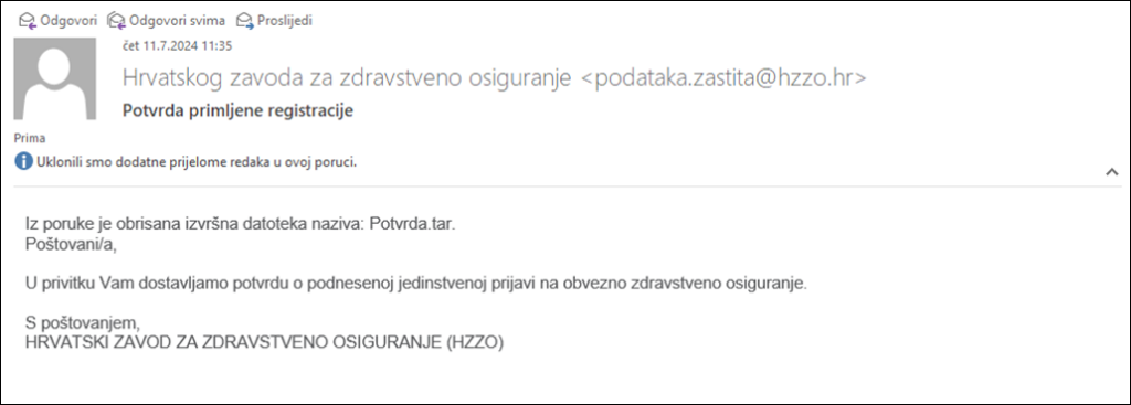 Iz HZZO-a su priložili i primjer maila poslan od strane prevaranata kako bi ga građani mogli lakše prepoznati ukoliko prime jedan takav.