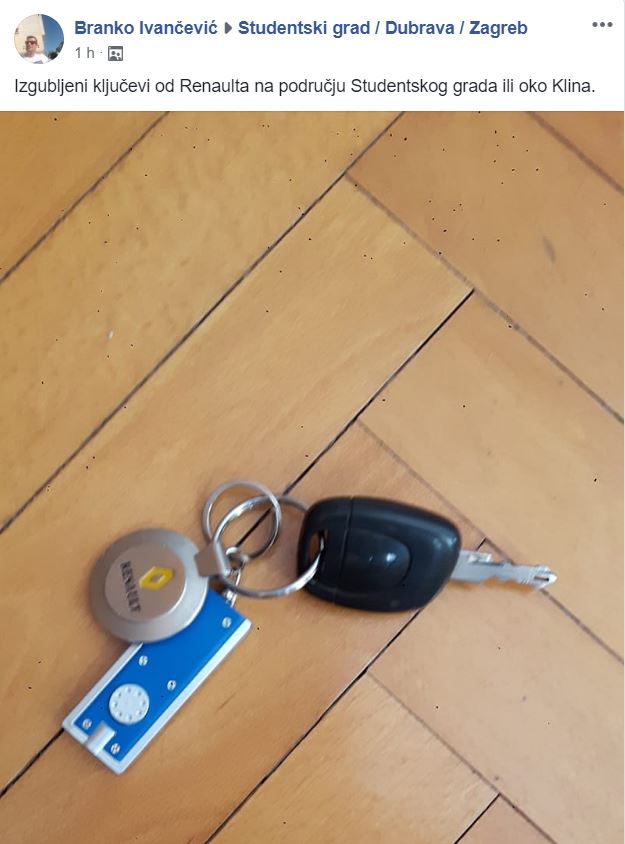 U jednoj Facebook grupi korisnik je objavio da su izgubljeni ključevi automobila marke Renault. Izgubljeni su na području Studentskog grada, odnosno oko Klina.