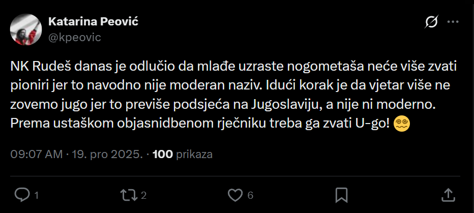 “NK Rudeš danas je odlučio da mlađe uzraste nogometaša neće više zvati pioniri jer to navodno nije moderan naziv”, započela je Katarina Peović na društvenim mrežama. Idući korak je da vjetar više ne zovemo jugo jer to previše podsjeća na Jugoslaviju, a nije ni moderno.