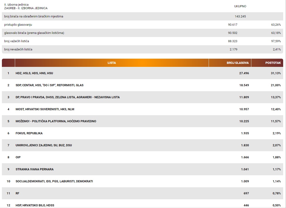 Osvojili su 61 mandat, slijedi ih SDP s 42, Domovinski pokret s 14, te Most s 11 i Možemo s 10 mandata. Trenutno je pobrojeno 99,76 posto svih listića, a to uključuje i sve one u Zagrebu, koji je ove godine bio u tri izborne jedinice – prvoj, drugoj i šestoj.