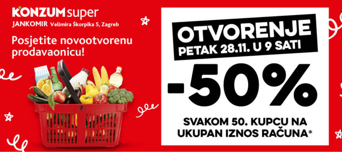Super Konzum u petak, 28. studenoga 2025., otvara novu prodavaonicu na Jankomiru, na adresi Velimira Škorpika 5. Otvorenje je zakazano za 9 sati, a riječ je o modernom prodajnom prostoru koji će kupcima ponuditi bogat izbor namirnica i dodatnih usluga.