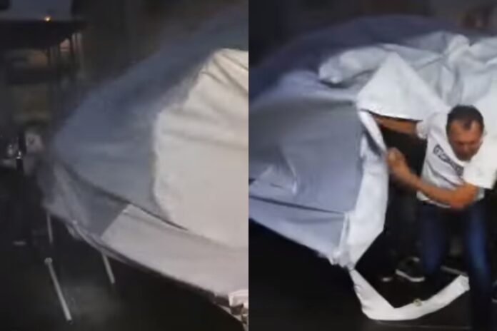 S obzirom na to da se ekstremno vrijeme nije smirivalo, a opasnost od izbacivanja metalnih šipki šatora nije prestajala, obrtnici su ih zajedničkim snagama odlučili odvojiti i šator spustiti na zemlju.