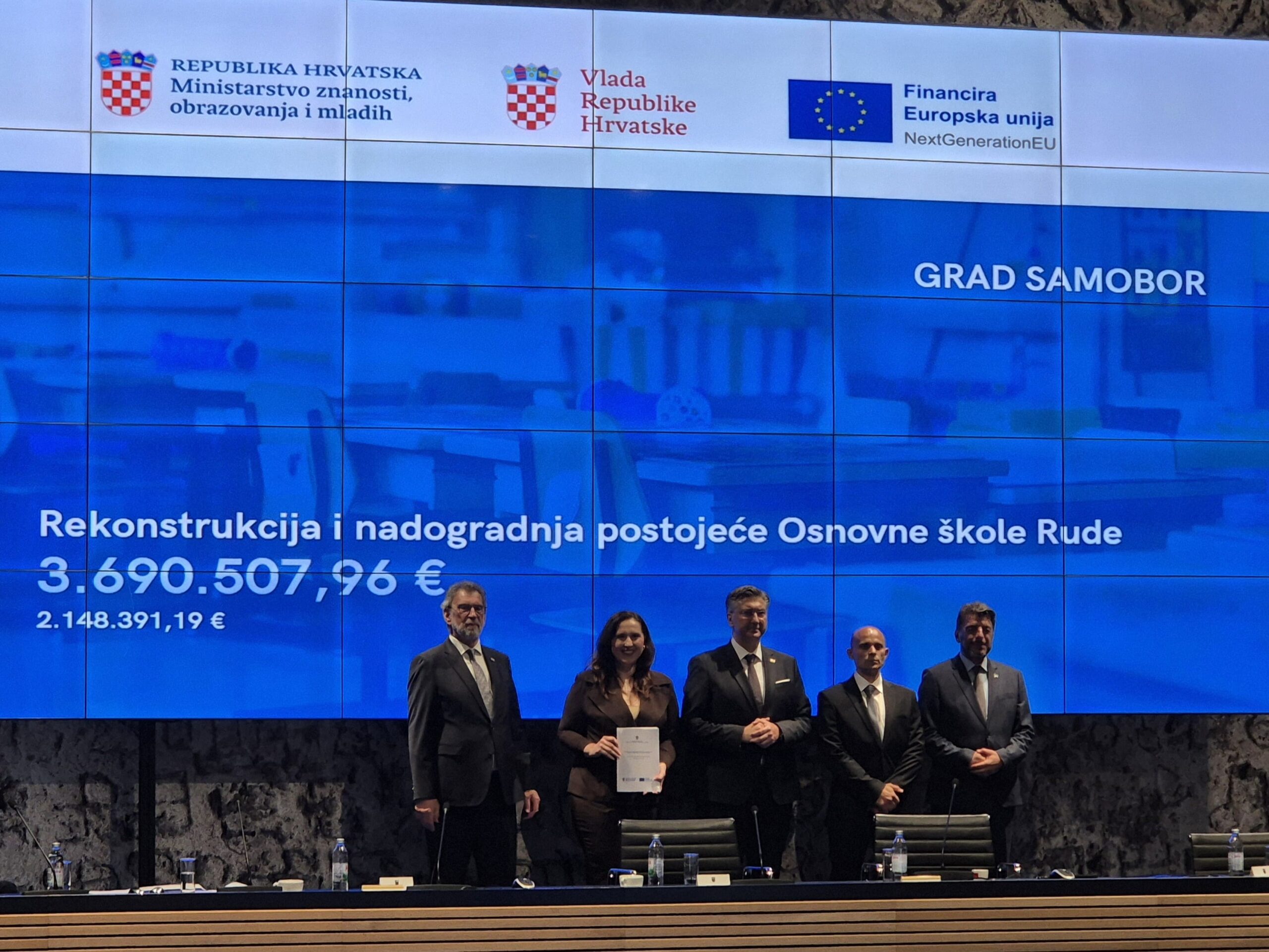 Gradonačelnica Grada Samobora Petra Škrobot potpisala je u četvrtak 5. lipnja, u Nacionalnoj i sveučilišnoj knjižnici u Zagrebu Ugovor o dodjeli bespovratnih europskih sredstava za projekt “Rekonstrukcija i nadogradnja postojeće Osnovne škole Rude“ koji se financira iz Nacionalnog plana oporavka i otpornosti 2021.-2026. Ukupna vrijednost projekta iznosi 3.690.507,96 eura, a Grad Samobor ostvario je bespovratnih 2.148.391,19 eura, što je najviši mogući iznos sufinanciranja za ovaj projekt. Projektom je planirana dogradnja 6 novih učionica čime će se stvoriti uvjeti za održavanje jednosmjenske nastave u školi u Rudama.
