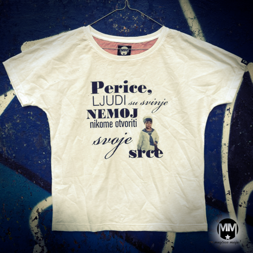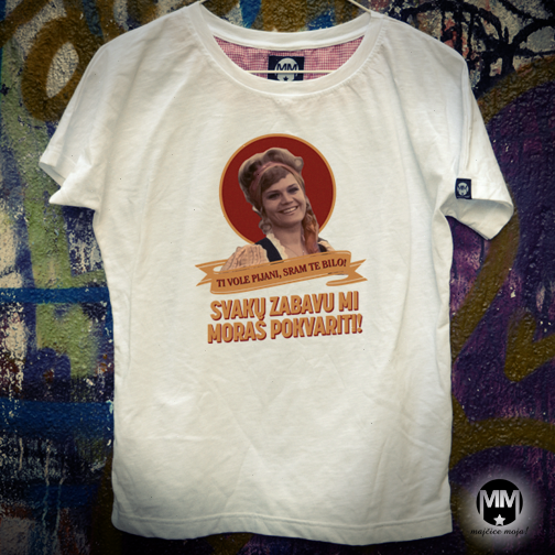 [box type=”info” align=”” class=”” width=””]Zato su mi hrvatski filmovi, gradovi, ljudi, pisci, specifični motivi iz 80tih, neke hrvatske izreke ili preokupacije draža inspiracija. Takav pristup MM bitno udaljava od globalno prisutnih šabloniziranih natpisa na majicama.[/box]California, USA, Vintage,… – riječi koje možemo naći na današnjim općeprihvaćenim dizajnima majica globalnih brandova ustupaju kod mene mjesto primjerice Franjinoj „Idem malo prek k Žnidaršiću“, svim pušačima poznatoj „Zapalim još jednu pa idemo“, smiješno realnoj „Nije to skupo nego si se ti loše udala“, itd.