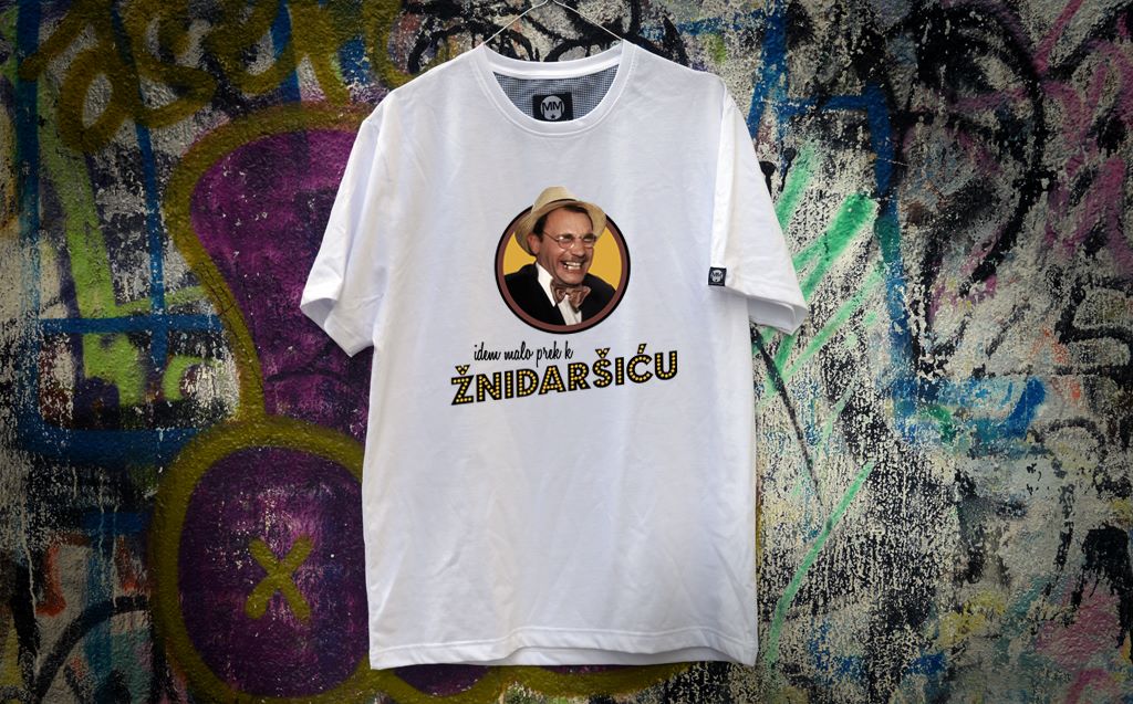 [box type=”info” align=”” class=”” width=””]Zato su mi hrvatski filmovi, gradovi, ljudi, pisci, specifični motivi iz 80tih, neke hrvatske izreke ili preokupacije draža inspiracija. Takav pristup MM bitno udaljava od globalno prisutnih šabloniziranih natpisa na majicama.[/box]California, USA, Vintage,… – riječi koje možemo naći na današnjim općeprihvaćenim dizajnima majica globalnih brandova ustupaju kod mene mjesto primjerice Franjinoj „Idem malo prek k Žnidaršiću“, svim pušačima poznatoj „Zapalim još jednu pa idemo“, smiješno realnoj „Nije to skupo nego si se ti loše udala“, itd.
