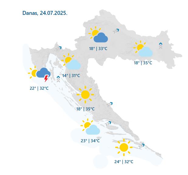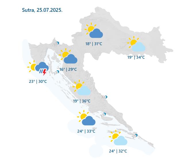 Dhmz za ponedjeljak prognozira pretežno sunčano uz umjerenu naoblaku. Na sjevernom Jadranu, od sredine dana i u zapadnim predjelima unutrašnjosti prolazno više oblaka uz mogućnost za kratkortrajnu kišu ili pljusak s grmljavinom.