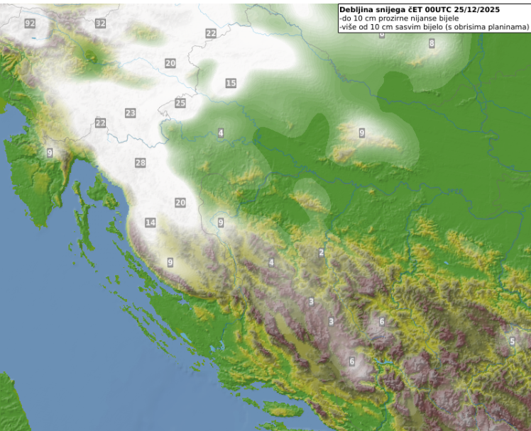 Nadalje, meteorolozi DHMZ-a opisali su kakvo se vrijeme očekuje na Badnjak. “24. prosinca 2025. oborina će biti češća i u unutrašnjosti. Već će u noći uz zahladnjenje u Gorskom kotaru i Lici kiša prelaziti u susnježicu i snijeg uz stvaranje snježnog pokrivača. Snijega će biti i u gorju istočne i središnje Hrvatske, no vjerojatan je i ponegdje u nizinama, ponajprije na sjeverozapadu zemlje, a nije isključeno ni stvaranje tanjeg snježnog pokrivača.