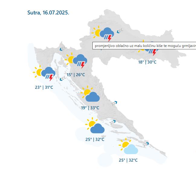 Nagla promjena stiže u srijedu piše DHMZ. Sa sjeverozapada postupno naoblačenje, u unutrašnjosti mjestimice kiša, u središnjim predjelima moguće obilnija. Lokalno i pljuskovi s grmljavinom, izraženiji ponajprije poslijepodne na istoku. Prema večeri pljuskova može biti na sjevernom i dijelu srednjeg Jadrana. Najviše sunčanog vremena na jugu zemlje.