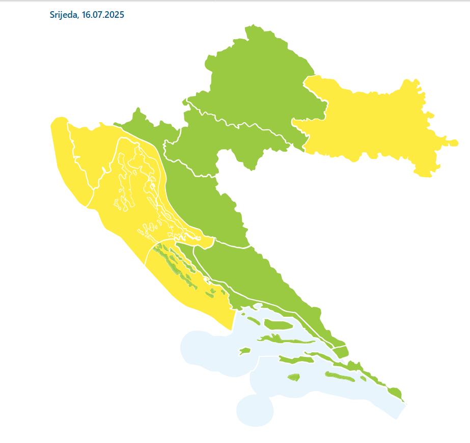 Za srijedu je DHMZ izdao žuto upozorenje za Riječku regiju i Osječku regiju. U riječkoj su upozorava na jaku buru, a u Slavoniji na neverijeme.