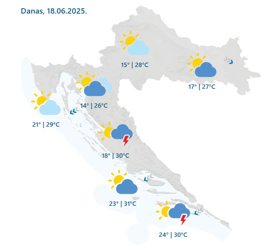 “Djelomice, na Jadranu i pretežno sunčano. Poslijepodne i navečer su u Dalmaciji, osobito u unutrašnjosti, uz jači razvoj oblaka mogući lokalni pljuskovi s grmljavinom. Vjetar većinom slab. Na Jadranu u prvom dijelu dana umjerena i jaka, podno Velebita na udare i olujna bura, zatim umjeren zapadni i sjeverozapadni vjetar. Najviša dnevna temperatura zraka uglavnom od 26 do 31 °C”, prognoza je Državnog hidrometeorološkog zavoda za srijedu.