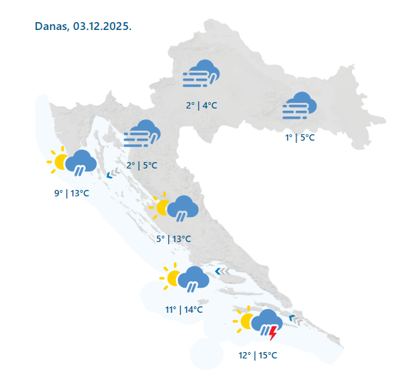 “Vjetar na kopnu većinom slab. Na Jadranu umjereno do jako jugo i istočni vjetar, dok će na sjeveru puhati umjerena bura. Temperatura zraka bez većeg dnevnog hoda, u unutrašnjosti većinom od 1 do 6, na moru između 10 i 15 °C”, navedeno je u prognozi DHMZ-a za srijedu.