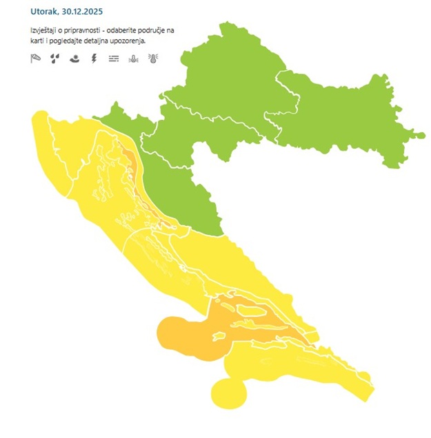 Zbog jake bure DHMZ je izdao meteoalarme za cijelu obalu, dok je narančasto upozorenje na snazi za područje Velebitskog kanala i srednje Dalmacije. “Očekujte i budite pripravni za olujne brzine vjetra u kombinaciji s lokalno visokim valovima koji su se već ili će se tek generirati. Upravljanje plovilom u tim uvjetima zahtijeva veliko iskustvo te adekvatno opremljena plovila. Preporučljivo je da pomorci bez odgovarajućeg iskustva potraže sigurnu luku prije početka potencijalno opasnog vjetra i valova. Vjerojatno je da mnogi katamarani i trajekti neće ploviti pa ako putujete, pratite informacije o prometu”, upozorava DHMZ.