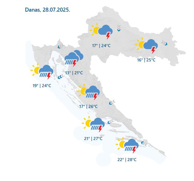 Na sjevernom Jadranu vrijeme je promjenjivo uz mjestimične pljuskove, dok se u Dalmaciji i na krajnjem jugu očekuju jače izraženi grmljavinski pljuskovi, osobito u poslijepodnevnim i večernjim satima. More će biti umjereno valovito, a vjetar će se mijenjati – od bure do juga i sjeverozapadnjaka.